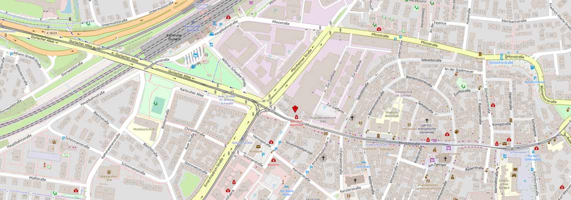 Von Karlsruhe oder A5 kommend (Ausfahrt 44-Karlsruhe-Durlach) "Durlacher Allee" in Richtung Durlach/Stutensee folgen. An Kreuzung "Durlacher Allee - Pforzheimer Straße" geradeaus überqueren in "Pfinztalstraße", bis Nummer 92 a auf der linken Seite, hinter Kreuzung "Zur Gießerei".